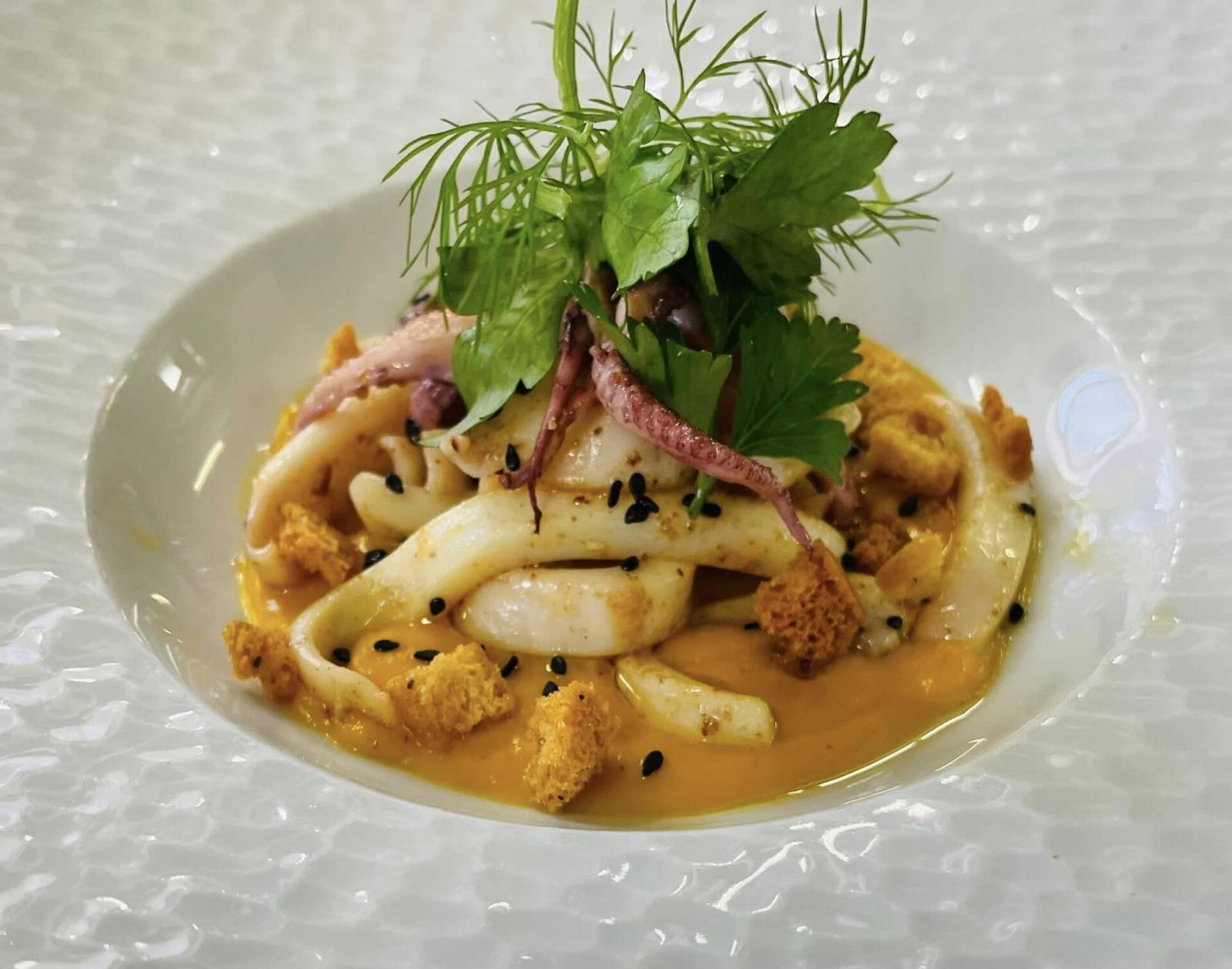Crème de courges à l’huile de noisettes, encornet juste snacké.