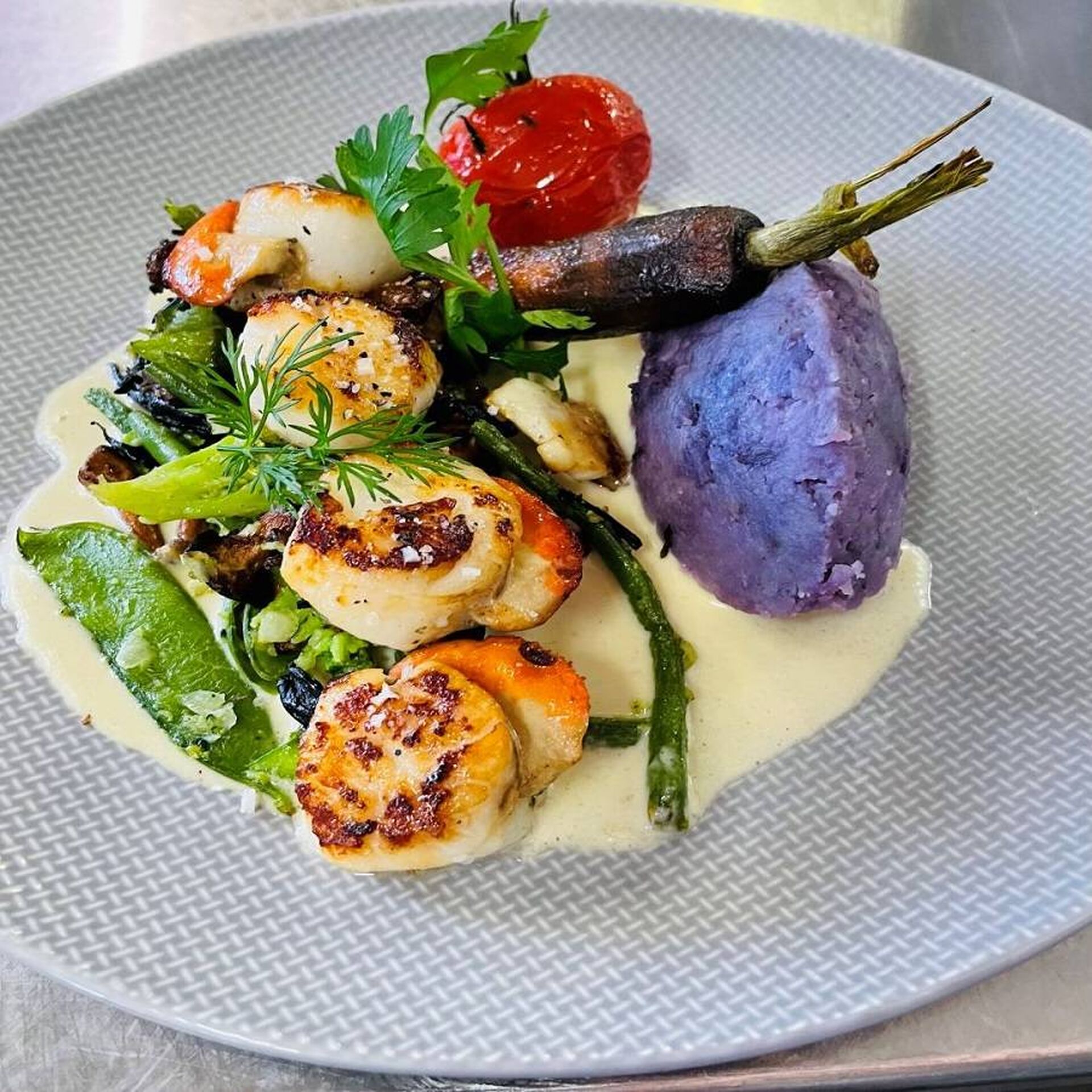 Coquilles Saint-Jacques de nos côtes aux petits légumes du moment.
