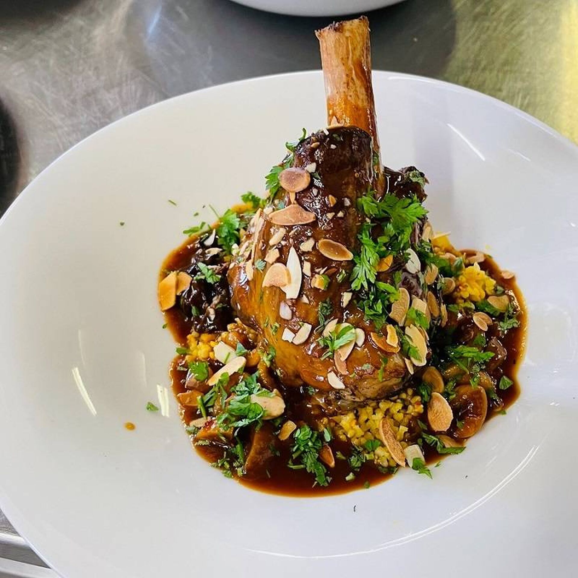 Souris d’agneau aux fruits confits et amandes, jus réduit, boulgour façon tajine.