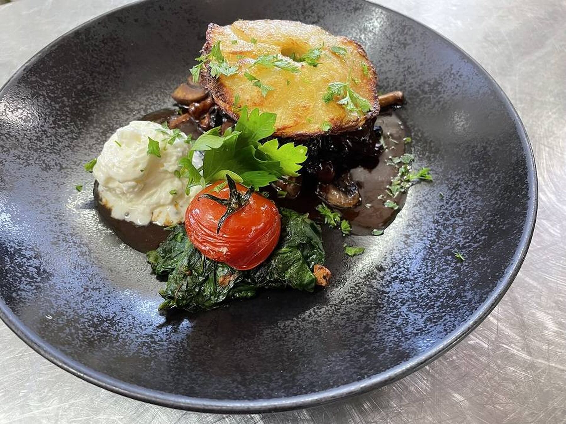 Joue de bœuf confite longuement, espuma de Camembert et pommes Anna.