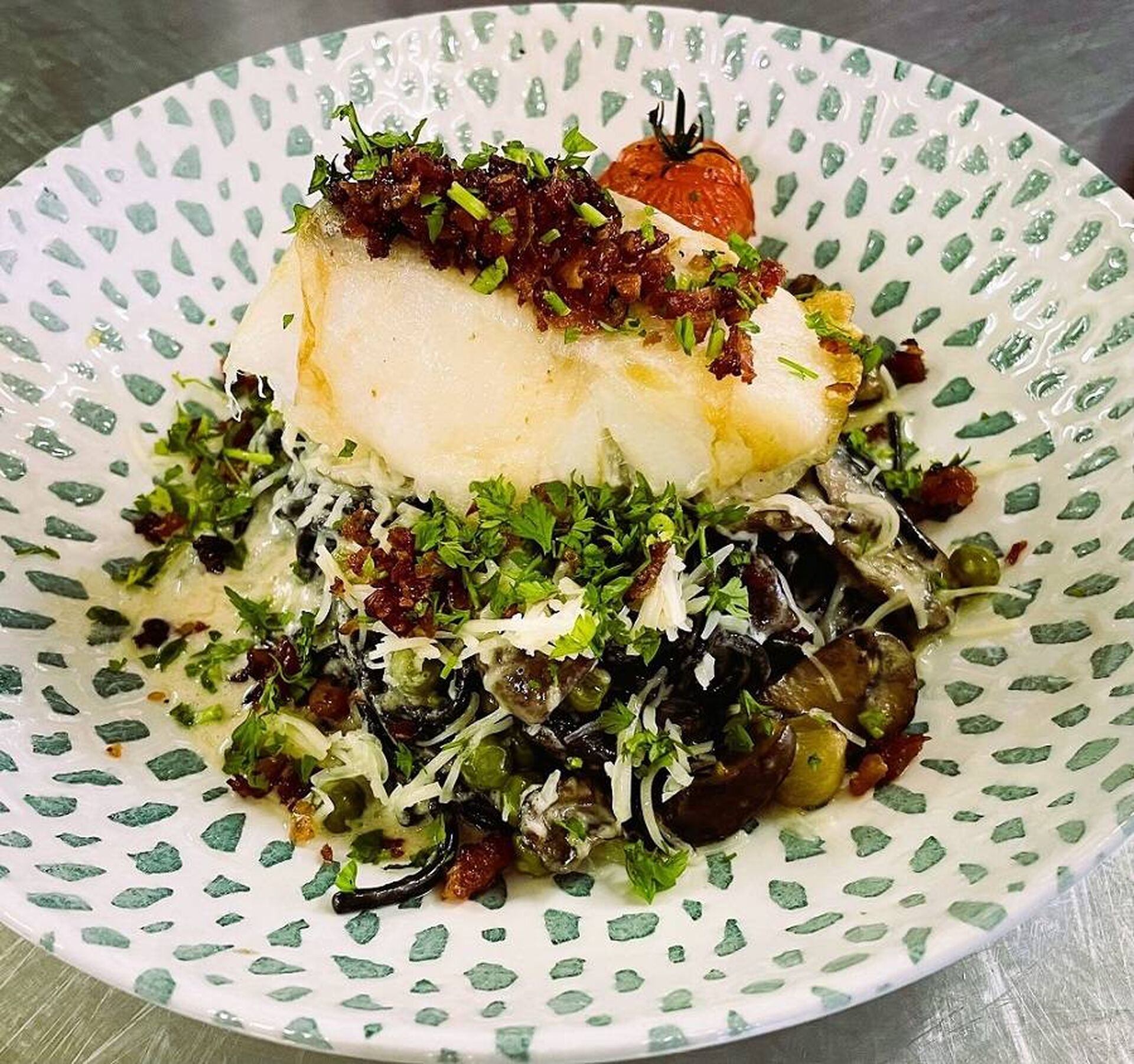 Dos de cabillaud au lard Colonnata, spaghettis à l’encre de seiche
