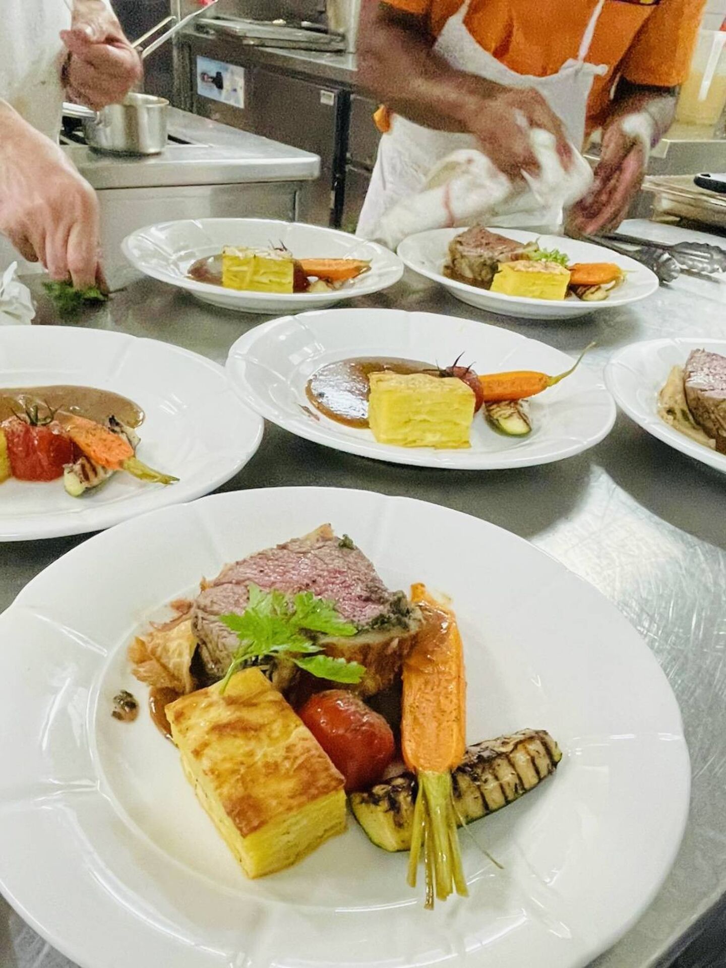 Pièce de bœuf Normand servie comme une côte, pommes croquettes et légumes de saison.