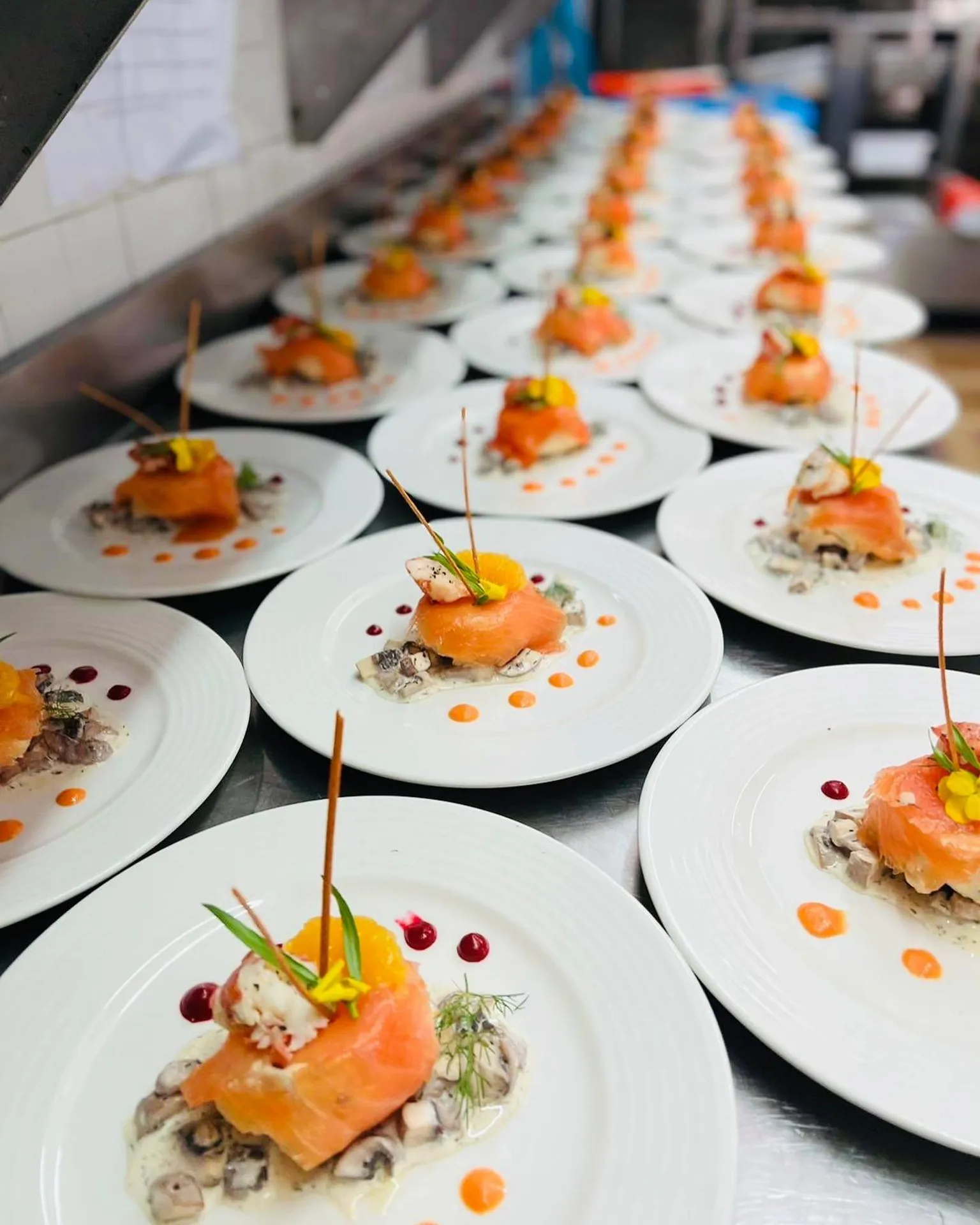 COCKTAIL  DINATOIRE  I Froid  avec  animation  au  buffet.   3 huîtres de Cancale  au  vinaigre  d’échalotes.      Saumon fumé maison et ses toasts.   Jambon fumé, roquette, parmesan, sur bruschetta.Brochettes de légumes.Foie gras de canard et sa confiture. 3 petites verrines.  Chaud  ave...